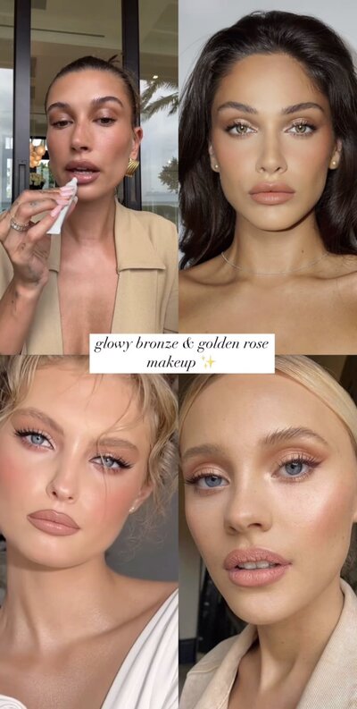 Nothing says “bridal glow” quite like a bronzed complexion paired with soft golden and rose tones. This makeup trend is perfect for brides who want to look naturally radiant with a touch of warmth. Think luminous, sun-kissed skin, soft peachy blush, and a glossy nude lip that enhances your natural beauty without overpowering it.